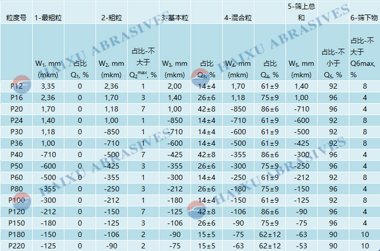 各個(gè)國(guó)家對(duì)白剛玉磨料粒度砂的型號(hào)要求基本一致,具體明細(xì)如下表: